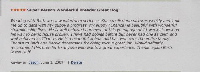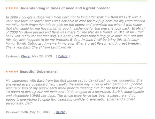 I will never use another breeder. I will only use Barnic Doberman breeder Barb. She is 100% tops. She keeps me informed about every aspect of the breeding though delivery continues.. with pictures and emails phone can be used but I never had to.. I will get ALL my Dobermans from her.. even though We will have to drive 5 or 6 hours to see her and the babies.. She has become a friend to us.. my husband and I love her..