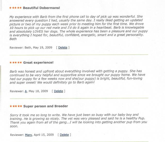 I just purchased a female fawn doberman from Barb. It has been a great experience so far. She has been very helpful and speedy about answering my questions. Barb sent me a receipt as soon as she received the deposit. I also have been receiving weekly updated pictures of my puppy. I can not wait until I get to take her home.