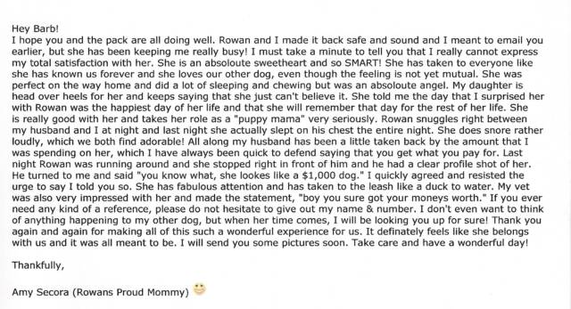 Barb has been just wonderful from the first time that I have contacted her regaurding the puppies that she had on the way. She emailed me a receipt as soon as she received my deposit and she responds almost immediately to my emails. She is very accomodating when we request pictures and we are looking very forward to picking out puppy up from her.